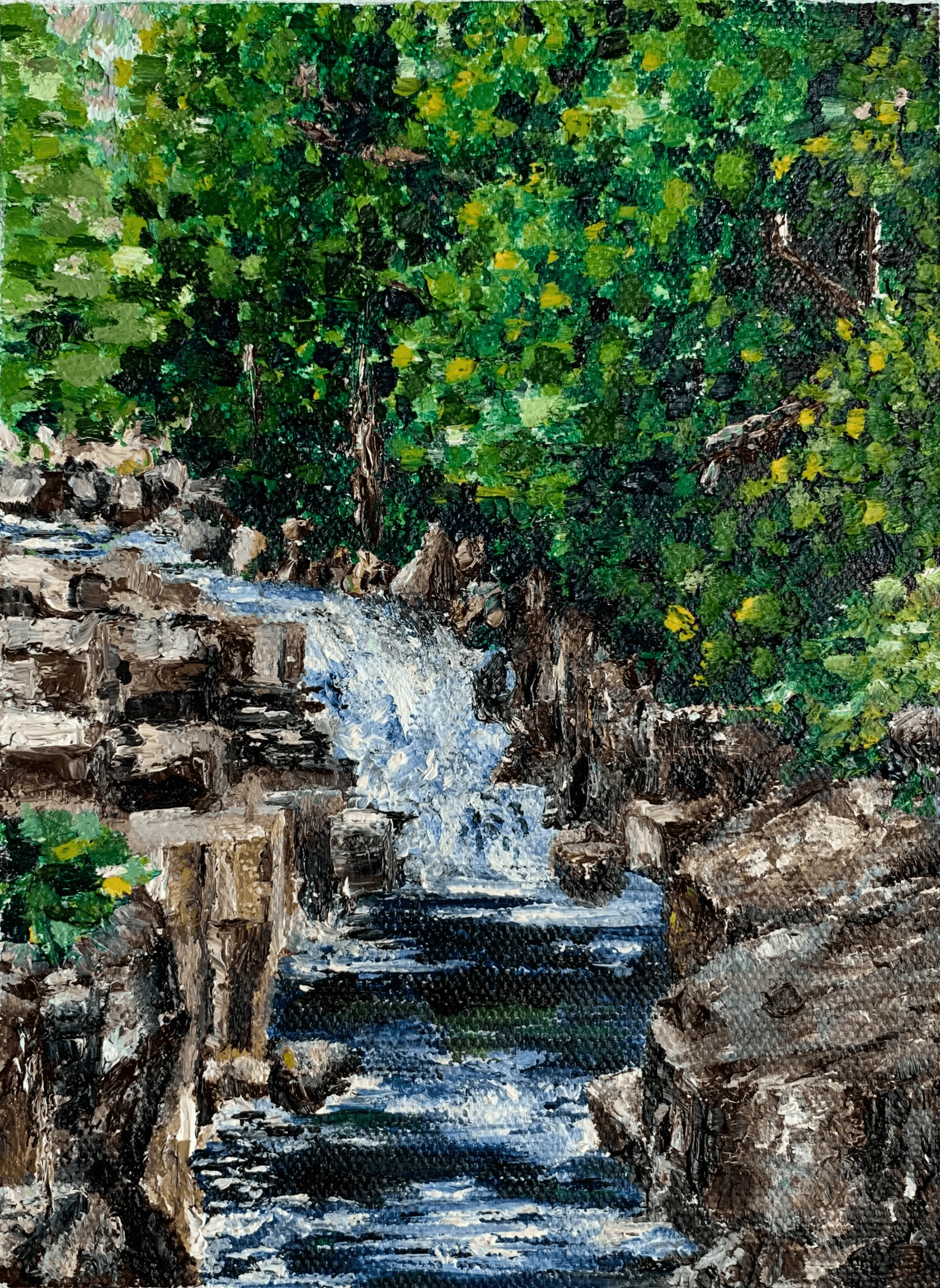 Yay hiking! My dad took a photo of a waterfall and I painted it. Water-based oil paint for fun :)