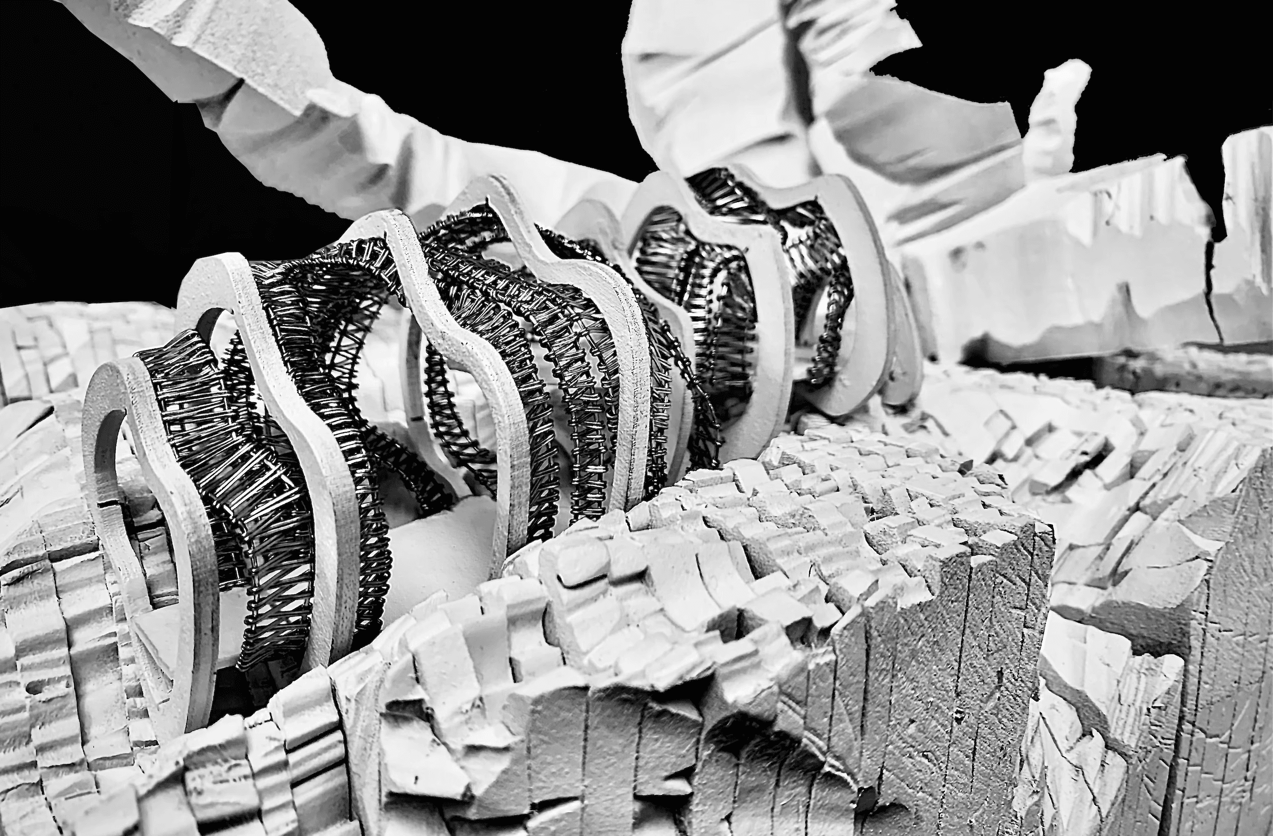 Model created using wood, wire weaving, and foam to mimic capsule meant for trash-mound landscape